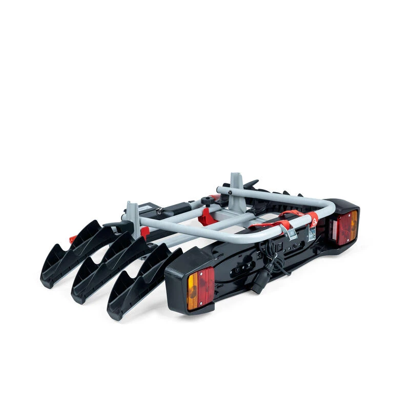Porte-vélos plateforme sur boule d’attelage pouvant supporter 3 vélos. Produit entièrement assemblé et système de montage rapide. Supports de cadre individuels pour fixation indépendante des vélos.