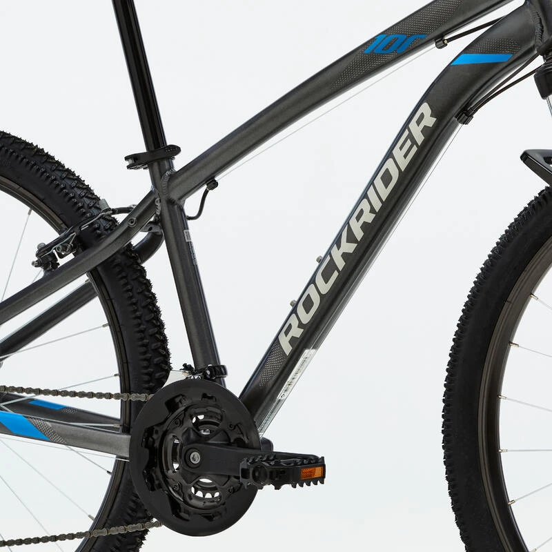 Le VTT ROCKRIDER ST 100 est livré avec des pédales VTT plates en résine dure pour plus de légèreté et de sécurité.