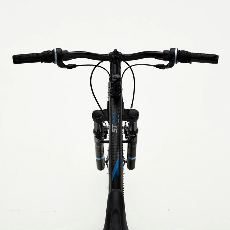 Le VTT ST 100 existe avec le même cadre en variante FEMME: selle adaptée, cintre plus étroit, potence plus courte, fourche avec un ressort plus souple et leviers de freins rapprochés.