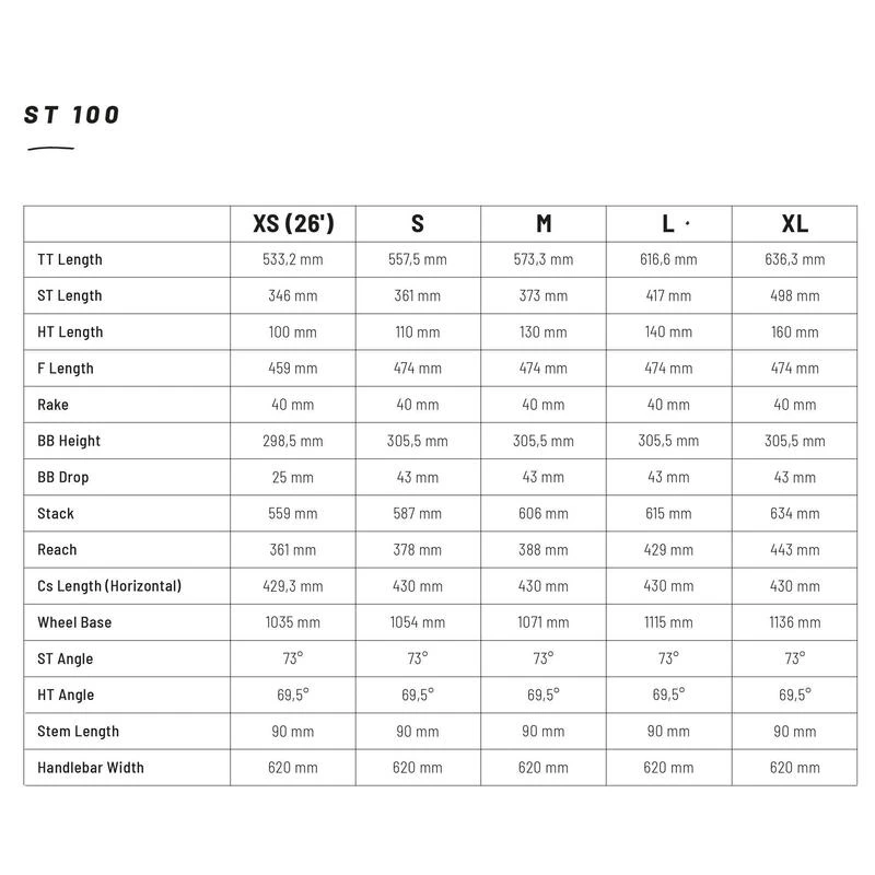 Les roues du ST 100 sont tolérantes et robustes, avec des jantes 27,5 pouces (26 pouces sur la taille XS) double parois 28 rayons. Franchissez sans crainte vos premiers obstacles : petites pierres, racines, trous et bosses !