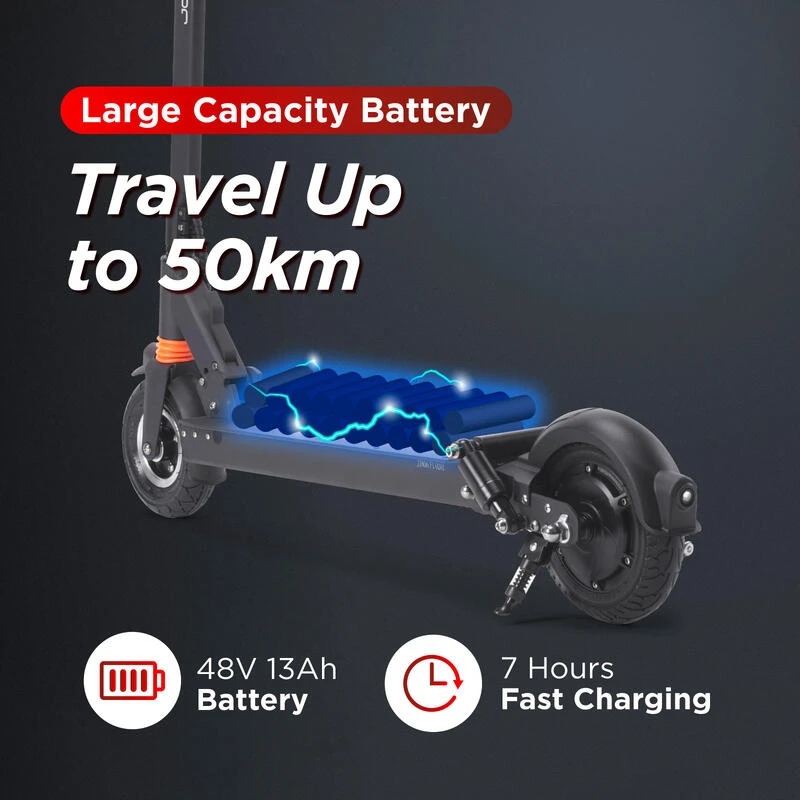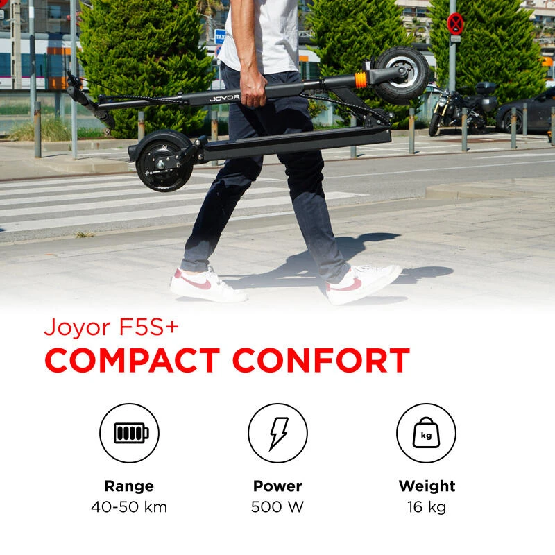 Le scooter électrique Joyor F5S + a une suspension avant et des feux avant et arrière alimentés par un écran LCD. La trottinette électrique Joyor F5S+ fonctionne avec un moteur de 500 W.